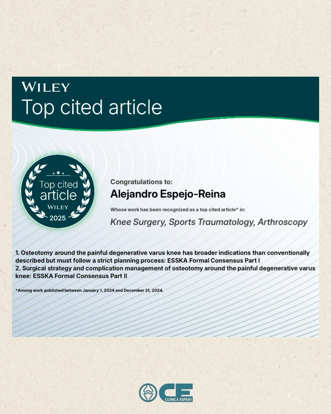 El Dr. Alejandro Espejo Reina es autor o coautor de diversas publicaciones científicas en revistas de alto impacto científico, así como de comunicaciones y ponencias en congresos nacionales e internacionales, lo que le ha reportado diversos premios y becas científicas.