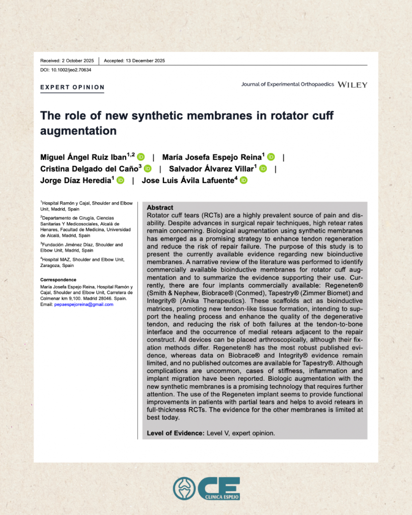 La Dra. @pepaespejo 👩🏼⚕️ha participado en un nuevo artículo en @jeo_journal sobre el uso de membranas sintéticas para mejorar la reparación del manguito rotador, un tema de gran actualidad en la cirugía de hombro.